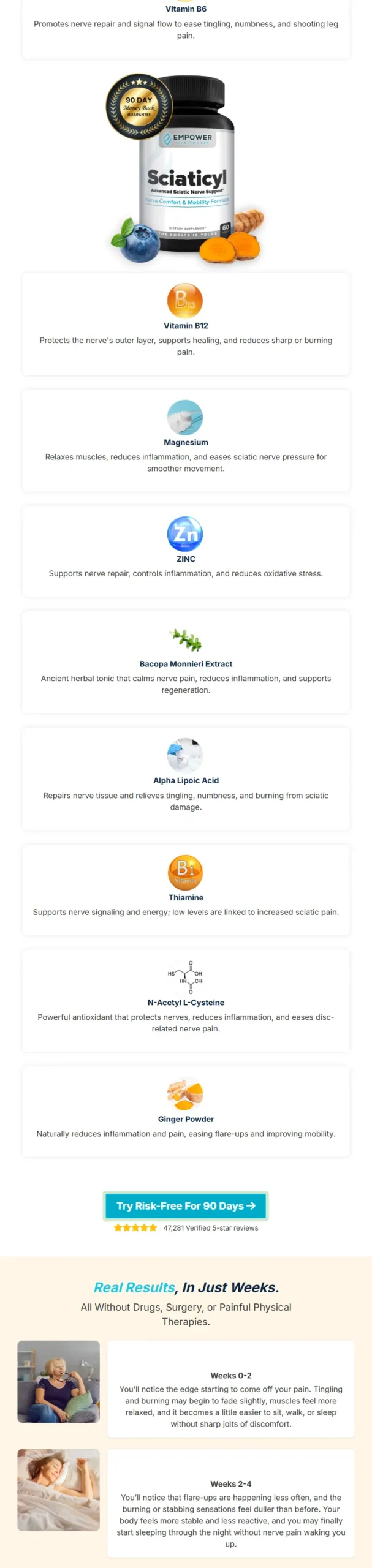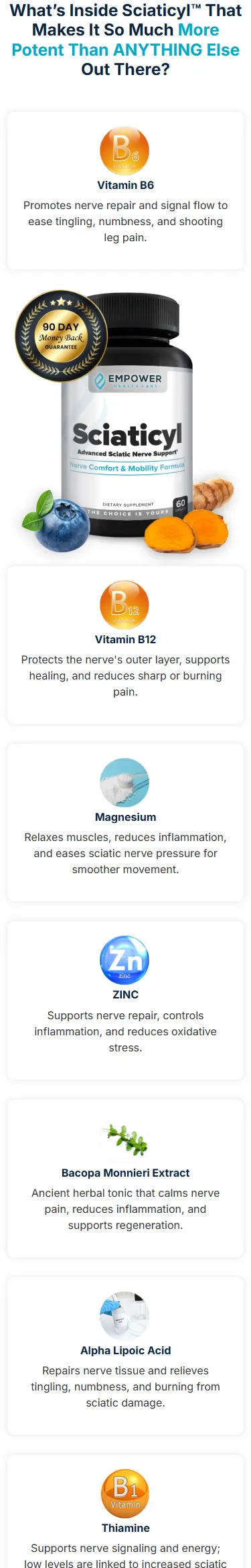 Its key ingredients are supported by scientific studies for their ability to reduce inflammation around the sciatic nerve, which is often the source of pain.